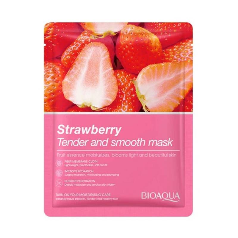 Bioaqua Strawberry Tender and Smooth Mask — single-use sheet mask formulated with strawberry fruit essence to deeply hydrate and renew the skin. This mask targets dry, dull, or rough skin by delivering concentrated moisture and nourishing ingredients directly through a soft fiber membrane cloth. The lightweight, breathable sheet fits closely to the face to maximize serum absorption and effectiveness.