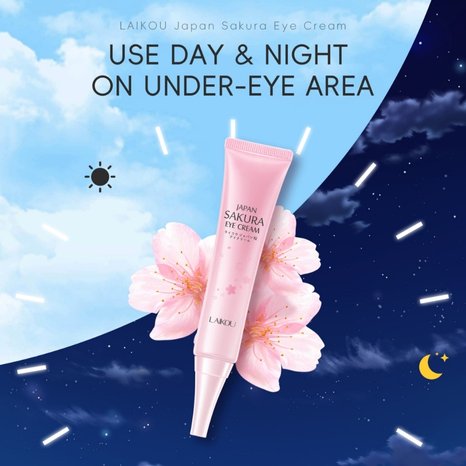 Laikou Japan Sakura Eye Cream is a gentle and hydrating eye treatment formulated with Sakura Extract, Hyaluronic Acid, and Vitamin C.