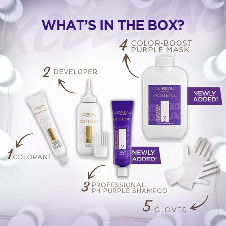 L’Oreal Paris Excellence Ash Supreme Vivid Colors with Triple Care and Anti-Brass Technology Salon Quality Results Visible even on Dark Hair 1. Protective Colouring Creme and Developer Enriched with protective serum actives. Lightening non-drip formula. 2. NEW Professional pH Purple Shampoo Balances pH level of hair to help lack in colour for lasting vibrancy. Cleans gently and maintains scalp comfort. 3. NEW Color-Boost Purple Mask Infused with pigments to boost ash reflects for instantly more vivid colour, Repairs and Nourishes for soft shiny hair. Visual name: L’Oreal Paris EXCELLENCE FASHION ASH SUPREME LAVENDER ASH 6.12