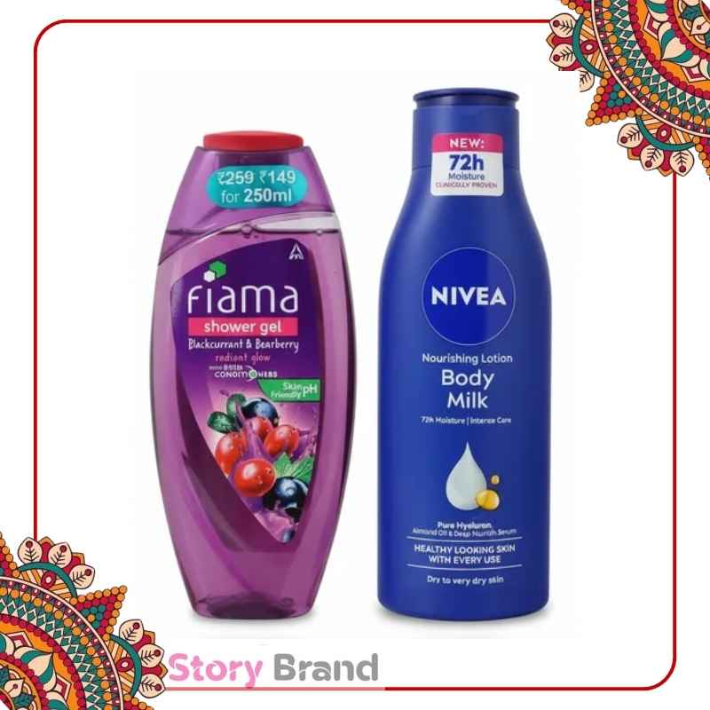 Fiama Blackcurrant & Bearberry Shower Gel (250 ml indicated on pack) + NIVEA Nourishing Body Milk (size varies) is a romantic Valentine Combo designed to deliver an aromatic cleanse followed by long-lasting moisturization. The Fiama shower gel features a refreshing blackcurrant and bearberry scent with micro-foam that removes dirt and impurities while promoting a radiant, conditioned feel. Packaging highlights skin‑friendly pH and conditioning properties that help leave skin smooth and lightly fragranced.