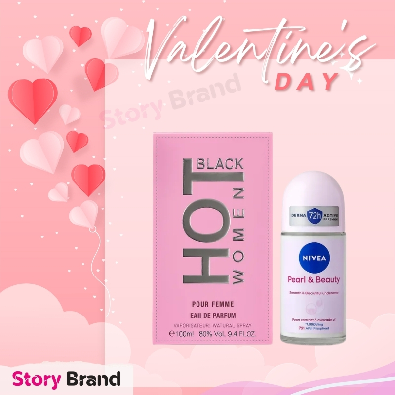 Hot Black Women Pour Femme Eau de Parfum (100 ml) + NIVEA Pearl & Beauty Roll‑On (visible size roll‑on) — Valentine Combo — brings together a striking fragrance and skin‑friendly deodorant for a thoughtful couple’s gift. The Hot Black eau de parfum (100 ml, 80% vol. indicated on packaging) is presented as a feminine, confident scent in a stylish pink box marked “HOT BLACK WOMEN POUR FEMME” and “EAU DE PARFUM.” As an EDP, it delivers richer concentration and longer-lasting projection than a body mist, making it ideal for daytime statement or evening wear.