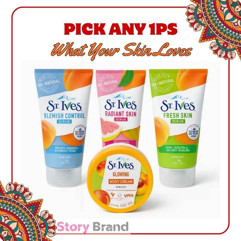 St. Ives Glowing Body Cream (150 ml) + St. Ives Face Scrub trio options (Radiant Skin scrub, Blemish Control scrub, Fresh Skin scrub — visible apricot and grapefruit variants) — Combo — combines targeted facial exfoliation with a rich, glow‑boosting body cream. The St. Ives face scrubs feature 100% natural exfoliants and fruit‑derived ingredients (apricot, grapefruit) to polish skin, slough away dead cells, and reveal a brighter, more even complexion. The Radiant Skin scrub targets dullness with gentle exfoliation; Blemish Control focuses on clarifying and mattifying skin; Fresh Skin offers refreshment and pore‑clearing benefits.